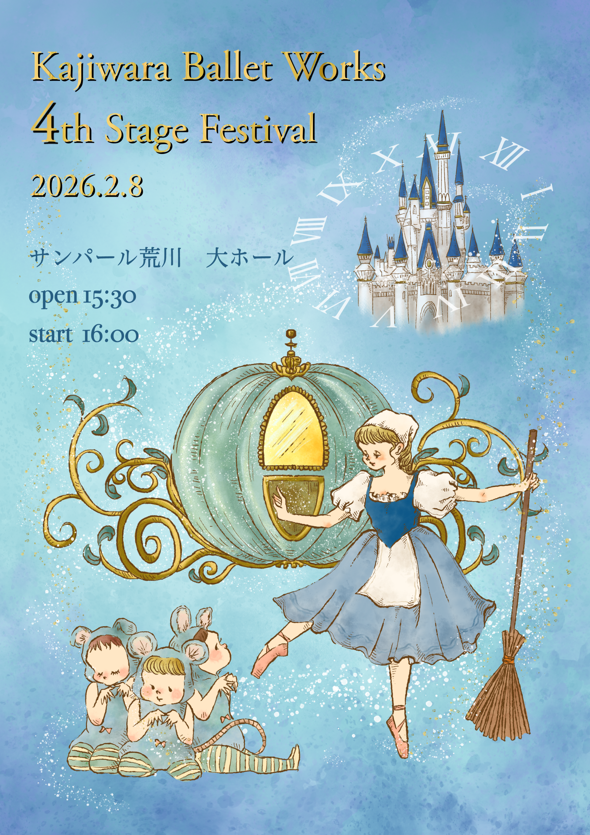 新しい年を迎え、寒さが一段と厳しくなってまいりましたが、皆さまいかがお過ごしでしょうか。 このたび、梶原バレエワークス第4回発表会を開催する運びとなりました。 日頃より温かく見守ってくださっている皆さまに、生徒たちが日々のレッスンを重ねてきた成果と成長の姿をご覧いただきたく、謹んでご案内申し上げます。 シンデレラ全幕のほか、パ・ド・ドゥや小品集、テーマパークダンス、また賛助出演していただく団体によるストリートダンスもお届けいたします。 舞台に立つ喜びを胸に、生徒一人ひとりが心を込めて踊ります。 ご多用とは存じますが、ぜひご来場いただき、温かいご声援を賜りましたら幸いです。 *入場無料、チケット不要です